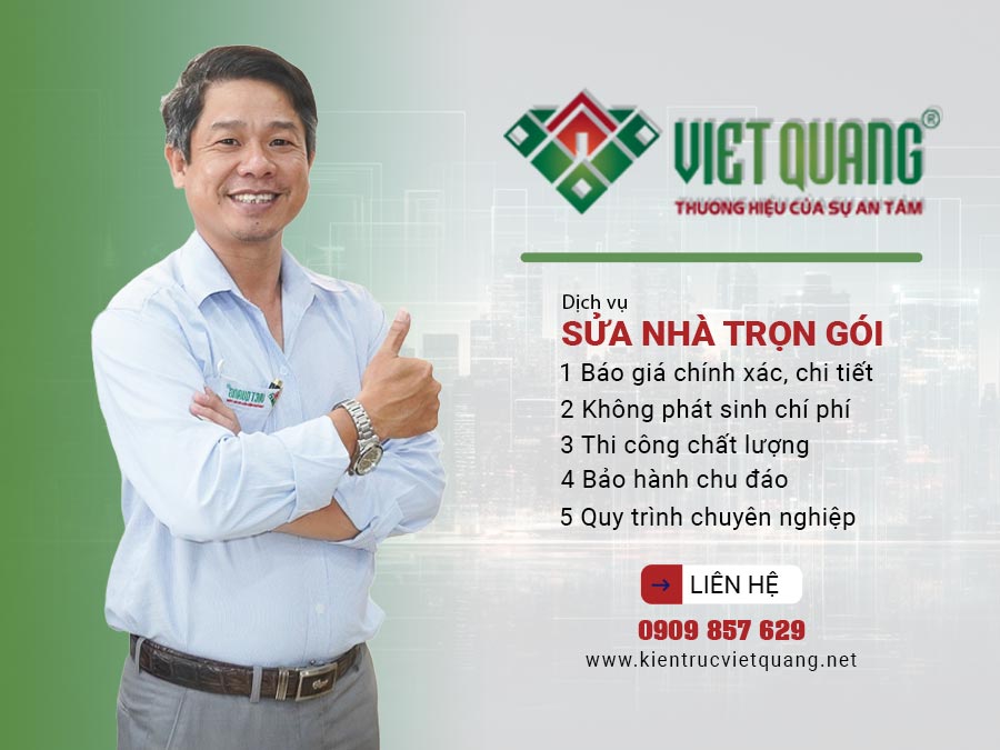 Dịch vụ sửa nhà trọn gói của Việt Quang Group là lựa chọn đáng tin cậy cho khách hàng mong muốn nâng cấp không gian sống. Điểm mạnh của dịch vụ nằm ở giá thành tối ưu theo từng nhu cầu cụ thể, chất lượng thi công ổn định, quy trình minh bạch – cam kết rõ ràng