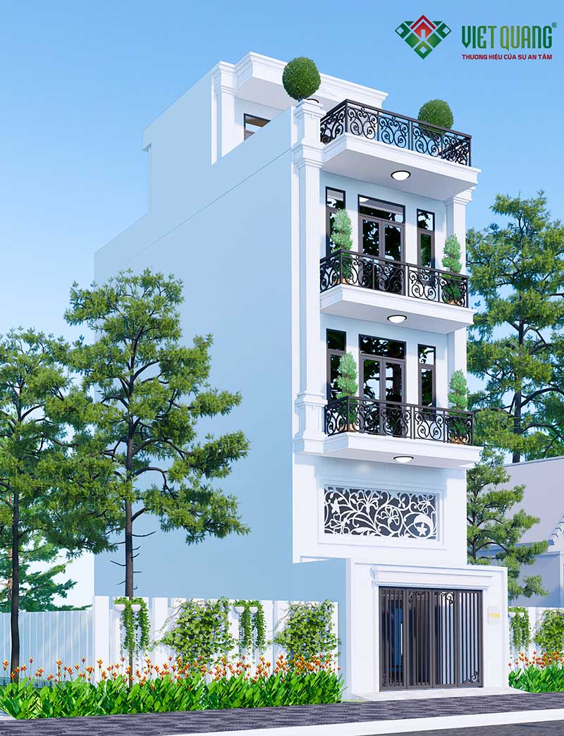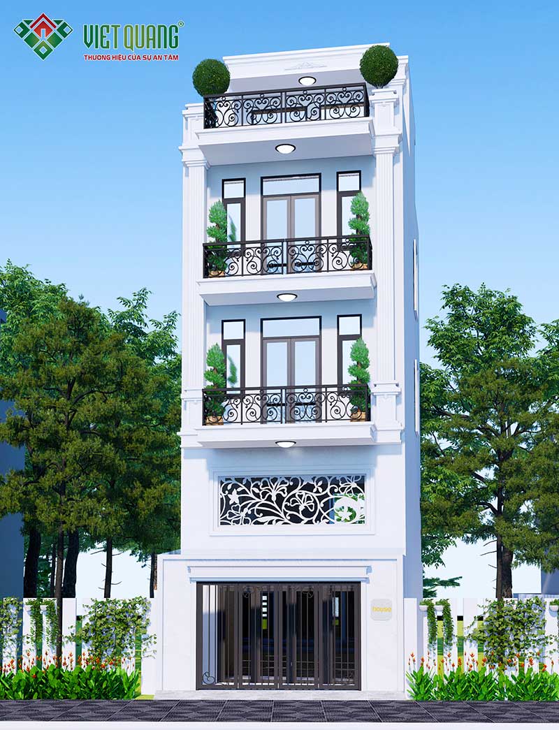 - Mặt tiền tinh tế, nổi bật với tone trắng chủ đạo kết hợp lan can sắt mỹ thuật uốn hoa văn sang trọng, tạo nên phong cách tân cổ điển nhẹ nhàng.