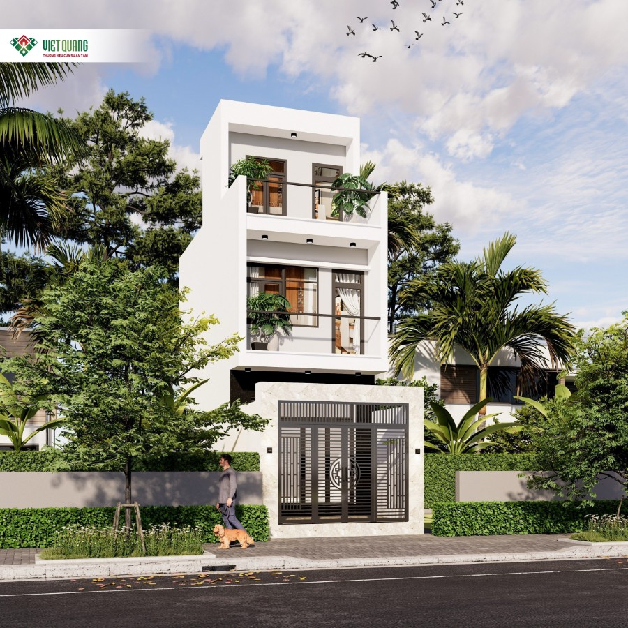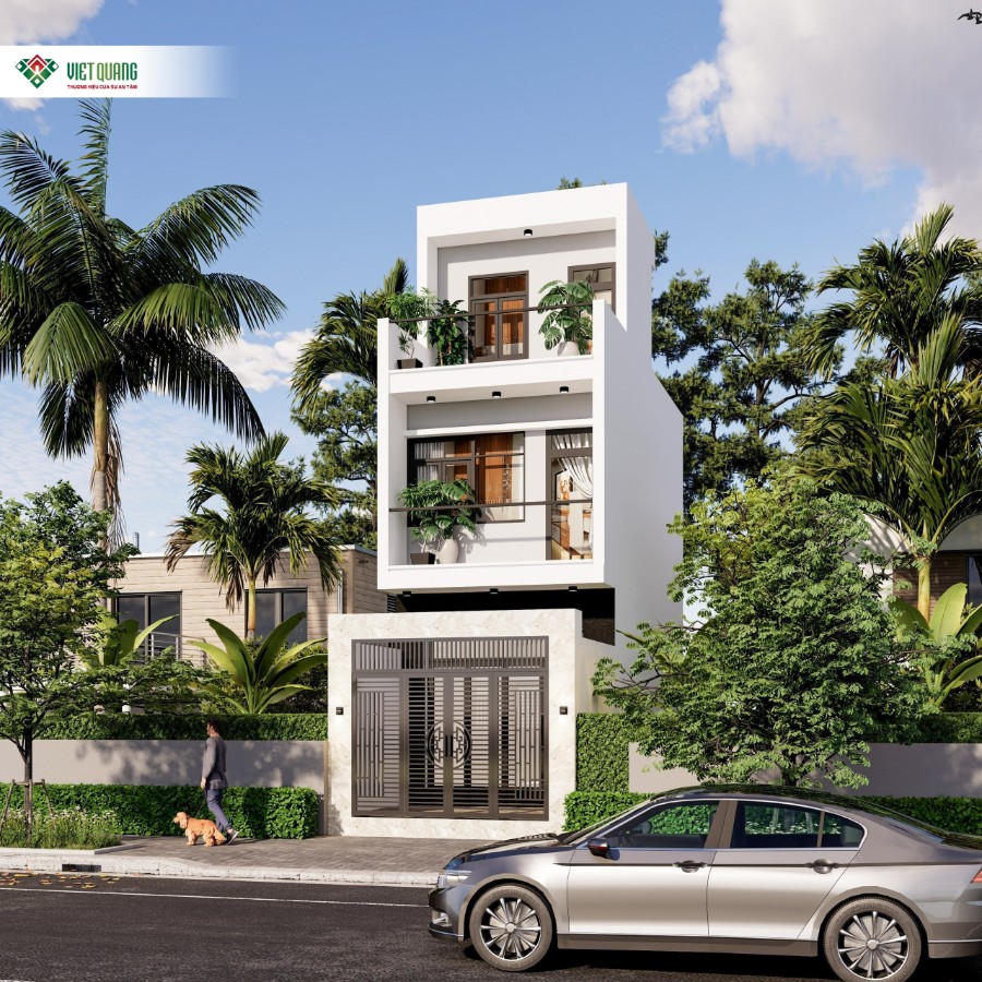 Phần mặt tiền của ngôi nhà được tạo hình theo khối hộp vuông vức, sử dụng tông màu trắng trung tính để tạo cảm giác rộng rãi, thanh lịch. Cửa chính sử dụng sắt CNC hoa văn truyền thống kết hợp hiện đại, đảm bảo sự an toàn nhưng không mất đi vẻ thẩm mỹ. Ban công các tầng được trang trí bằng cây xanh, tạo sự kết nối với thiên nhiên, đồng thời giảm nhiệt và bụi cho không gian bên trong.
