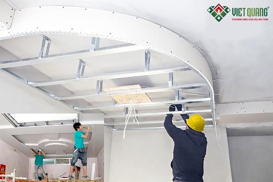 - Tấm thạch cao: Kích thước phổ biến 1220 x 2440 x 10mm, lắp đặt so le, tuyệt đối không trùng mạch.