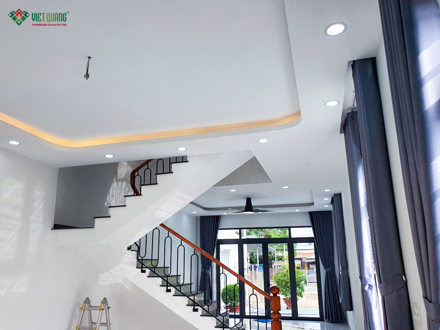 Giai đoạn hoàn thiện quyết định tính thẩm mỹ và trải nghiệm sử dụng lâu dài của ngôi nhà. Các hạng mục hoàn thiện bao gồm cán nền, ốp lát gạch, chà ron, lăn sơn nước, thi công trần thạch cao, lắp đặt hệ thống điện nước, thi công nội thất. Đội ngũ thợ lành nghề của Việt Quang Group thi công tỉ mỉ, cẩn thận trong từng chi tiết, đảm bảo ngôi nhà hoàn thiện đúng với phong cách và mong muốn của gia chủ.