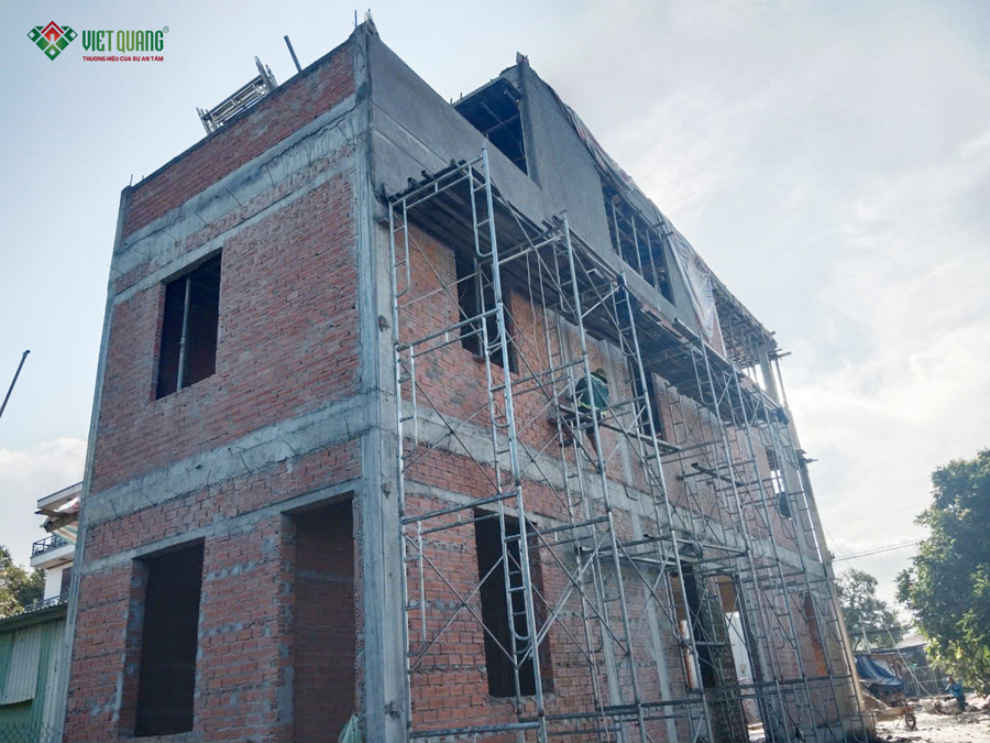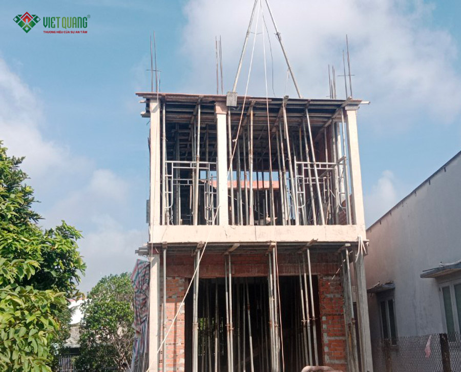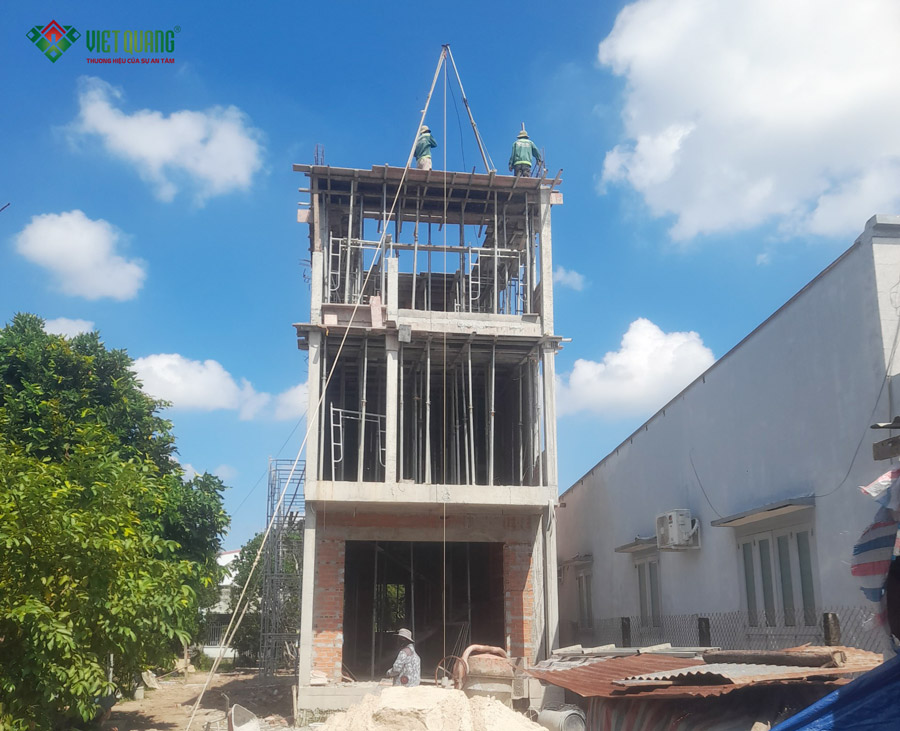 Hạng mục thi công xây thô nhà 1 trệt 1 lầu tum sân thượng 5x19m được hoàn thành trong khoảng 30 ngày, bao gồm gia công, lắp đặt cốp pha, thi công cốt thép sàn, dựng cột, dầm, đổ bê tông sàn, xây tường bao, thi công cầu thang, bảo dưỡng bê tông. Kỹ sư Việt Quang Group lập kế hoạch thi công chi tiết dựa trên hồ sơ thiết kế kết cấu, giúp công trình được vận hành đúng tiến độ – đúng ngân sách – đúng chất lượng.