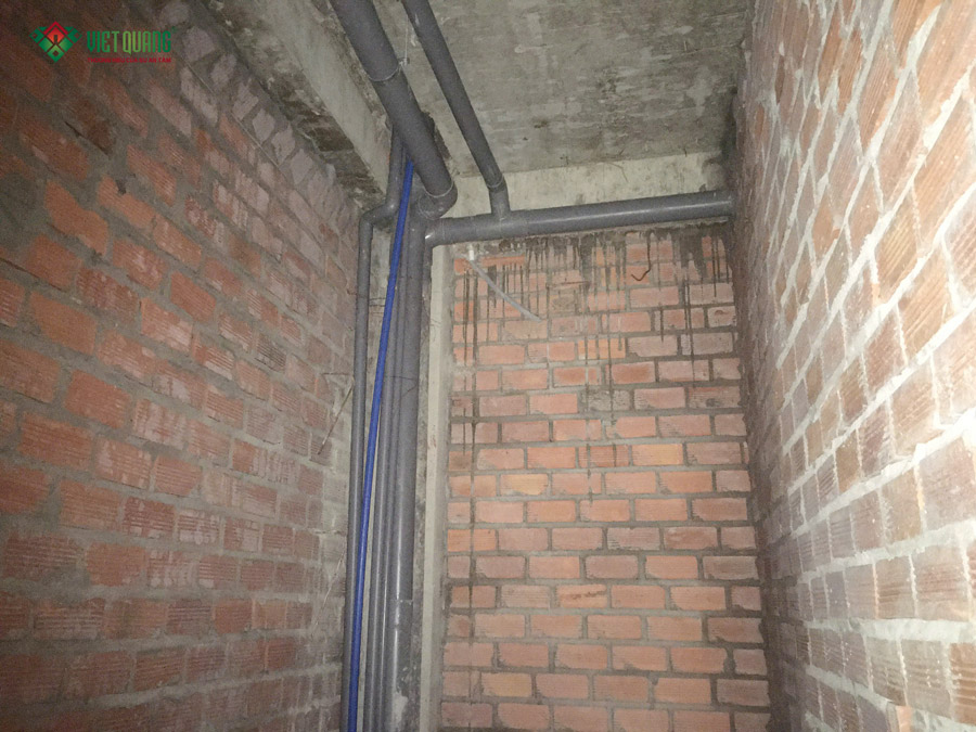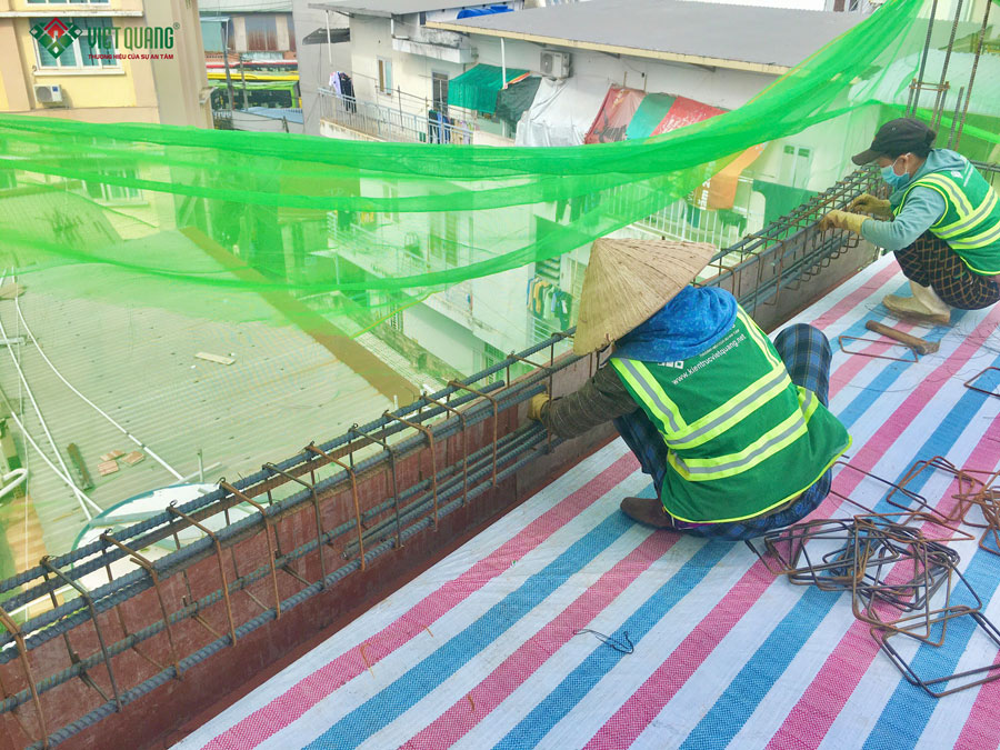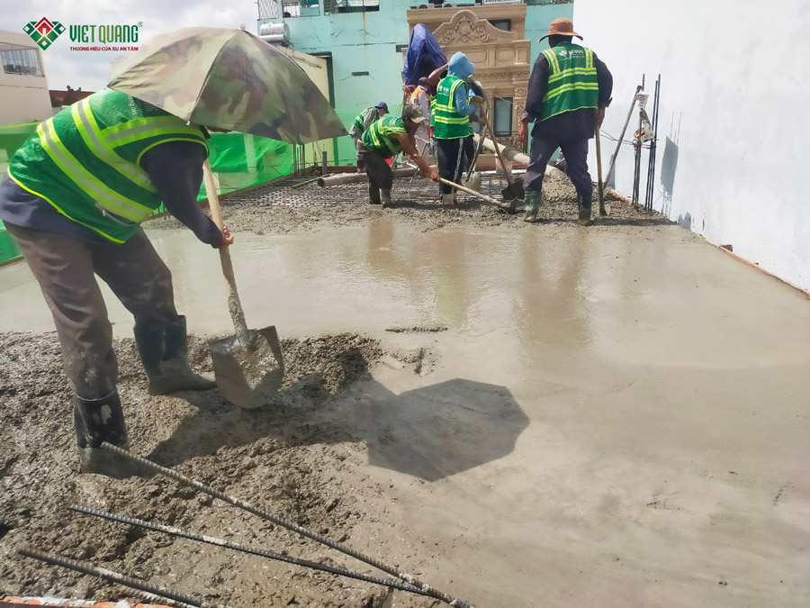 Thi công phần khung là giai đoạn quan trọng nhất, quyết định độ bền và an toàn của ngôi nhà. Việt Quang Group triển khai thi công cột bê tông cốt thép thẳng, vuông góc, dầm sàn liên kết đúng thiết kế kết cấu, bố trí giằng sàn tăng độ cứng và ổn định, đổ bê tông sàn, xây tường bao, thi công hệ thống điện nước âm tường, tô tường, chống thấm các khu vực cần thiết. Quy trình được lặp lại lần lượt từ tầng 1 đến tầng thượng, đảm bảo chất lượng đồng đều cho toàn bộ công trình.