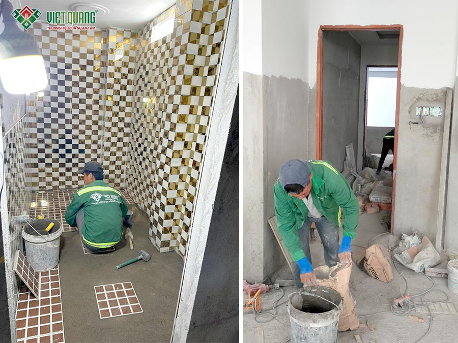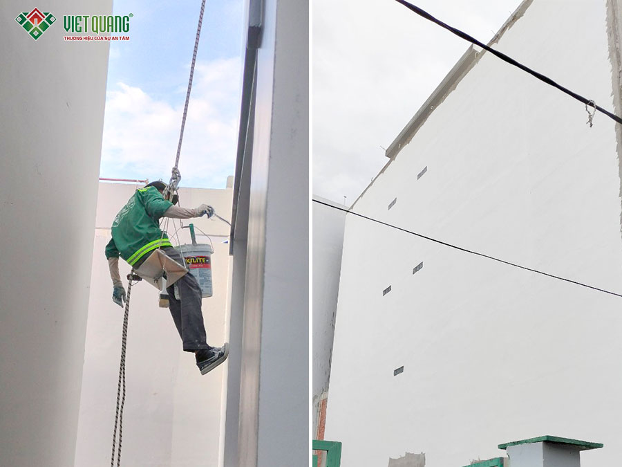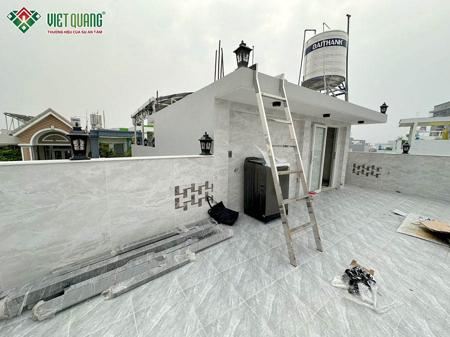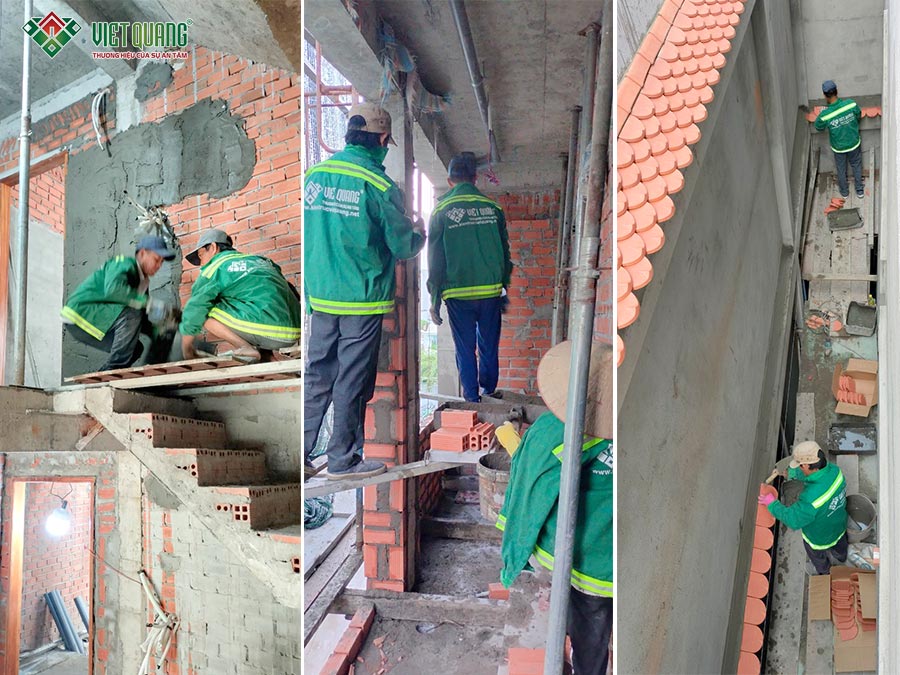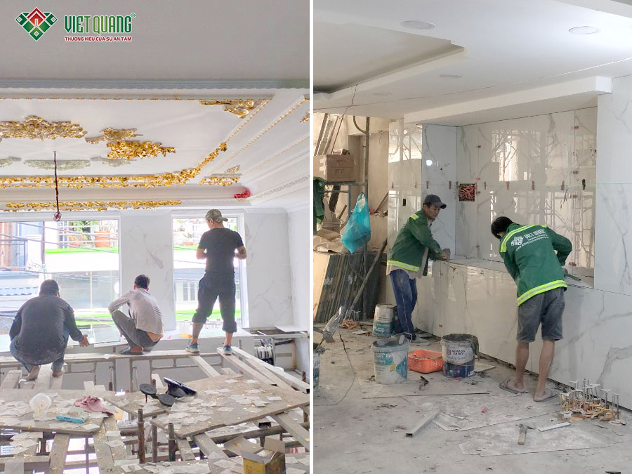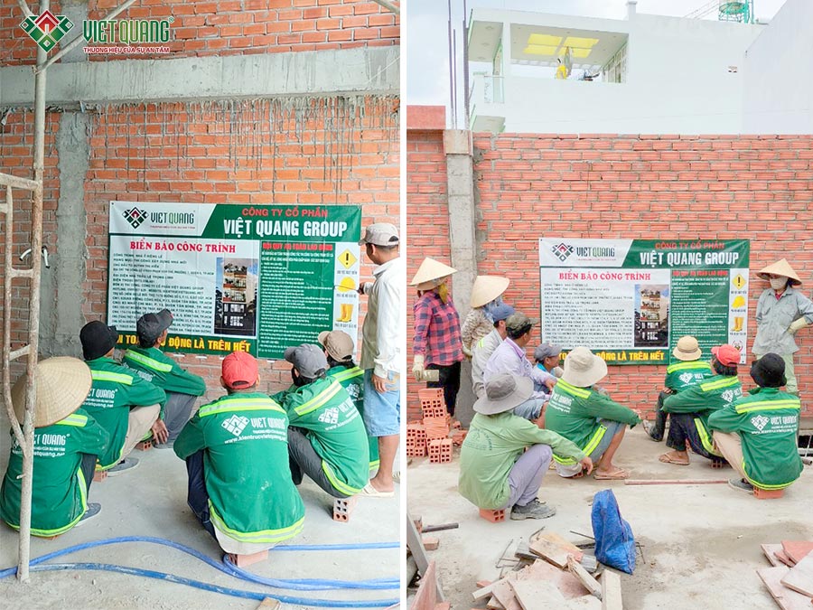 Khi kết cấu phần thô hoàn tất, đội ngũ Việt Quang Group nhanh chóng triển khai giai đoạn hoàn thiện: ốp gạch tường, sơn lót – sơn nước, trang trí cột trụ, các chi tiết thẩm mỹ… Song song đó, công tác an toàn lao động luôn được nhắc nhở và đào tạo liên tục thông qua các buổi họp nhanh tại công trình, giúp thi công đúng quy định và an toàn.