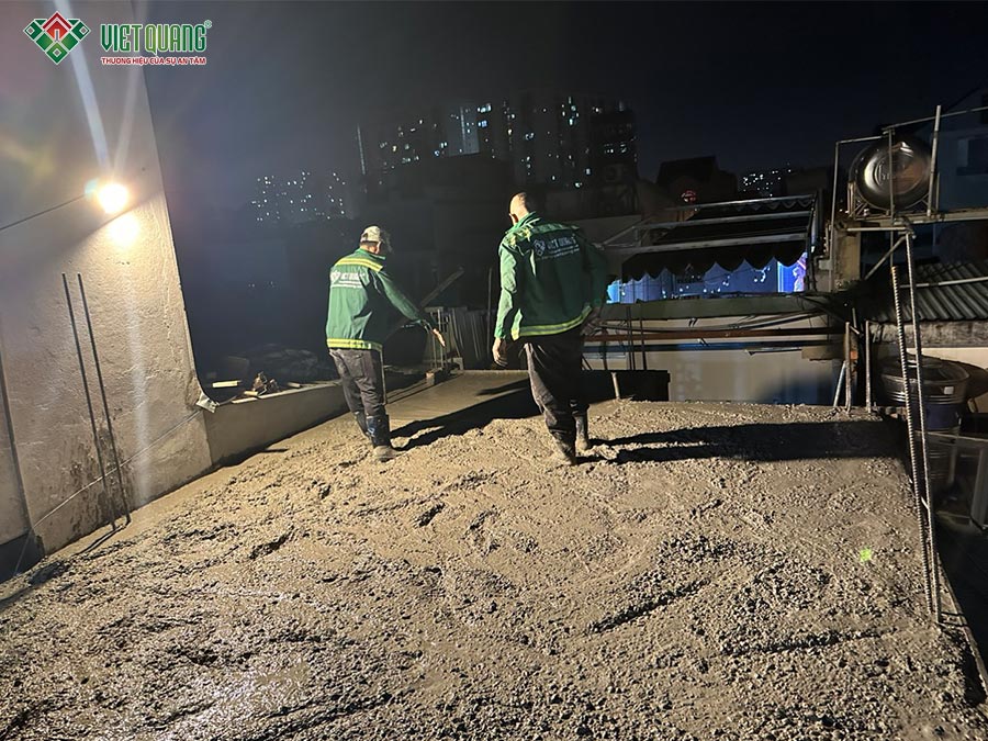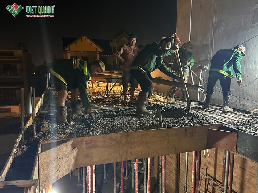 Tại công trình, anh Linh chia sẻ công tác chuẩn bị đổ bê tông lầu 1 được hoàn tất trước 17h, gồm: sắt thép sàn – trụ – cột, lót bạt chống thấm, ván khuôn… Công tác đổ bê tông dự kiến triển khai liên tục trong đêm để kịp chuyển sang giai đoạn dựng trụ cột chuẩn bị thi công lầu 2.