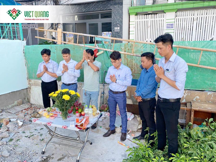 Chọn ngày lành tháng tốt, Việt Quang Group cùng gia đình chị Hiền thực hiện lễ động thổ, chính thức khởi công xây dựng. Trong ngày khởi công, các hạng mục chuẩn bị được hoàn tất gồm: tháo dỡ công trình cũ, san lấp mặt bằng, định vị tim cọc, xác định ranh giới và phạm vi xây dựng.