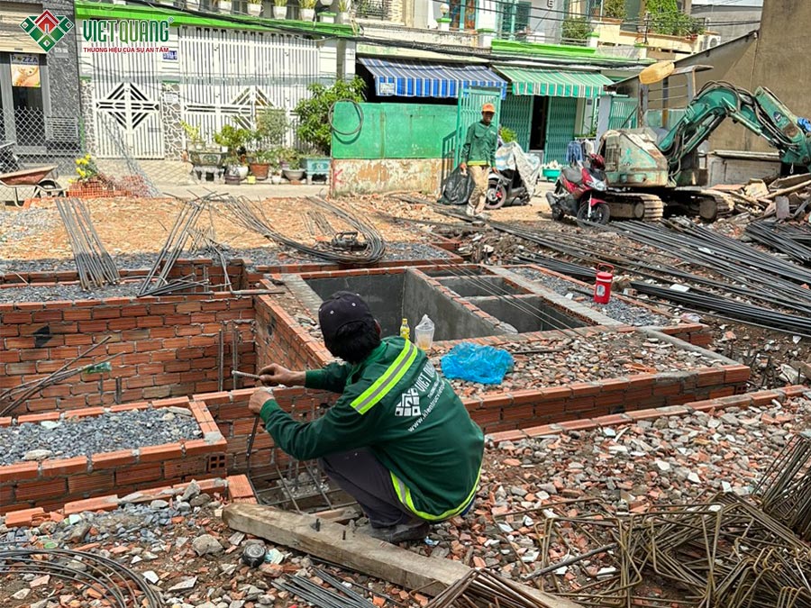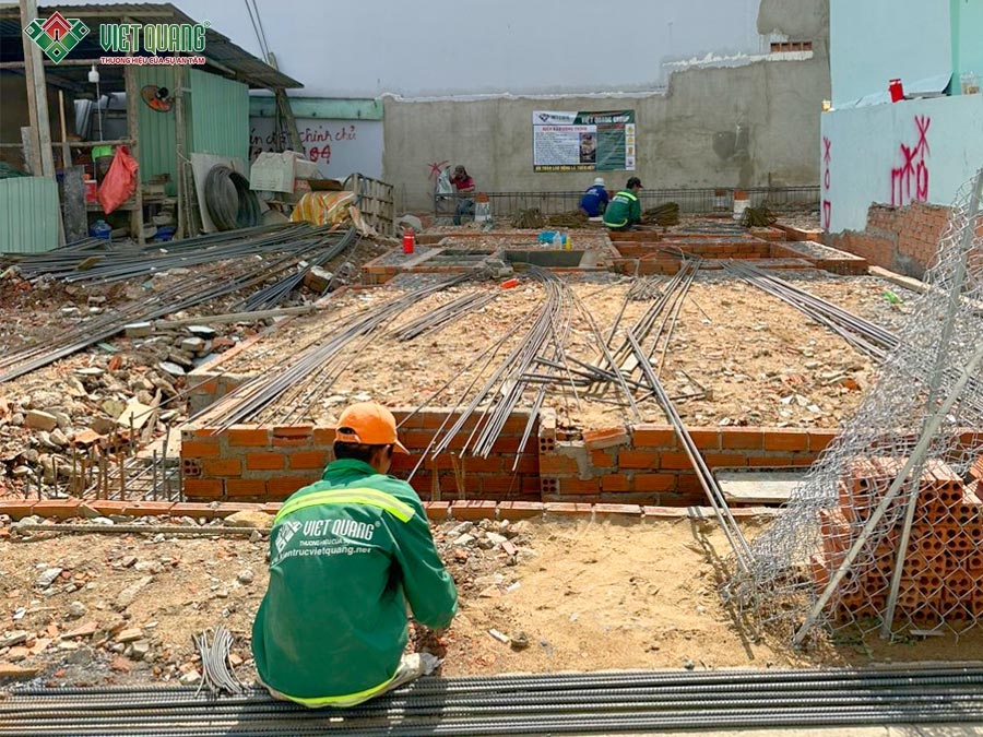 Sau khi hoàn tất gia cố nền, đội ngũ tiến hành thi công đài móng, dầm móng, giằng móng… Các công việc bao gồm: xây vách ngăn hố móng, lắp đặt thép, gia cố ván khuôn và chuẩn bị cho công tác đổ bê tông theo đúng quy trình.