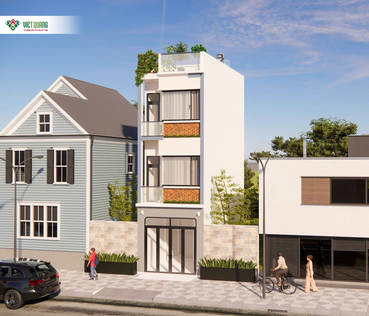 Trong phương án thiết kế, đội ngũ Kỹ sư – Kiến trúc sư Việt Quang lựa chọn phong cách hiện đại, sử dụng các mảng kính lớn giúp không gian bên trong luôn sáng và thông thoáng. Điểm nhấn mặt tiền là các chi tiết gạch thô trang trí, tạo nét mộc mạc nhưng vẫn mạnh mẽ, cá tính. Sự kết hợp hài hòa giữa vật liệu hiện đại và đường nét kiến trúc dứt khoát mang đến vẻ đẹp độc đáo, cuốn hút cho ngôi nhà.