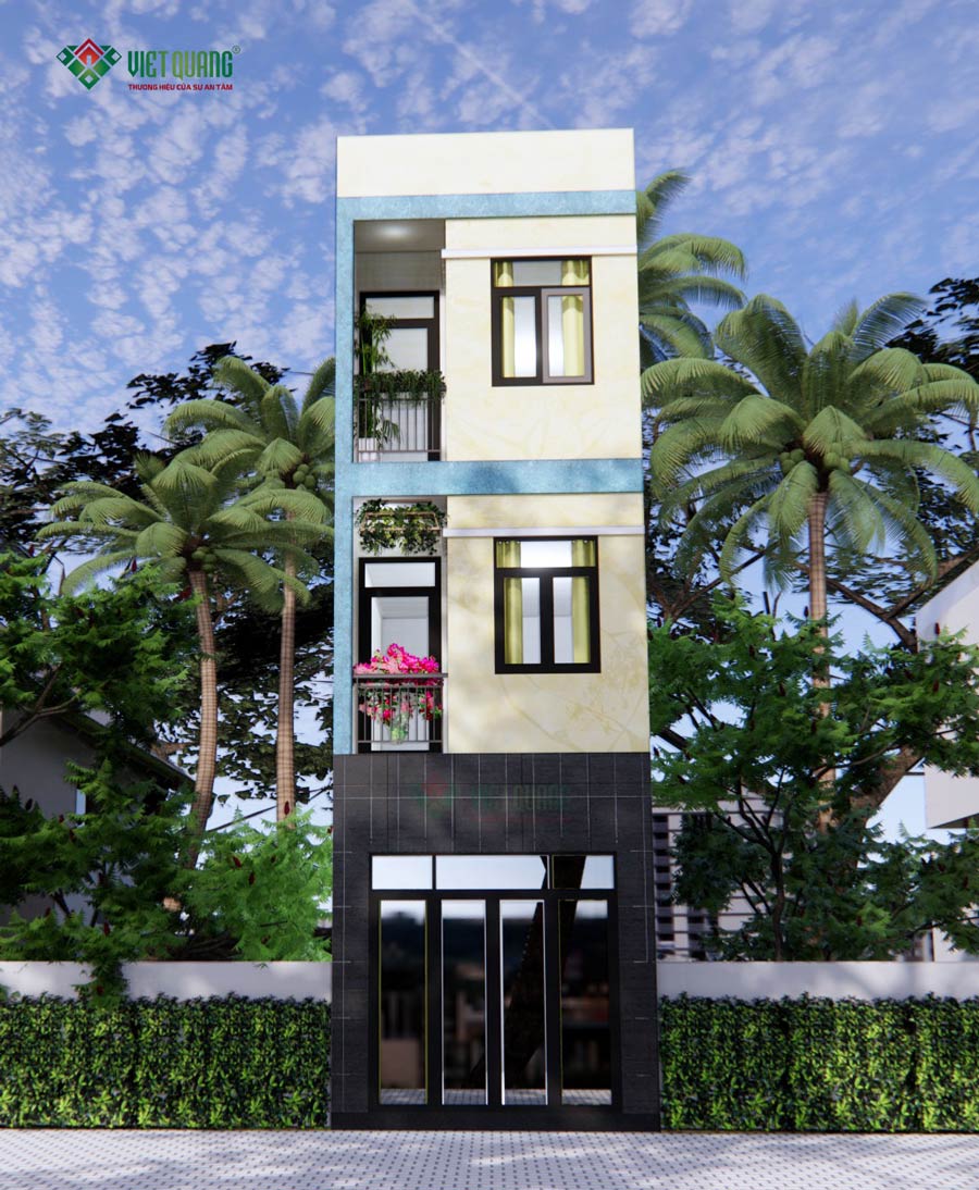 Mặt tiền nhà được thiết kế theo phong cách hiện đại, tối giản, sử dụng mảng màu xanh dương – vàng nhạt tạo cảm giác tươi mới, trẻ trung. Ban công được bố trí bằng bề rộng cửa phòng, vừa giúp lấy sáng tự nhiên tốt hơn, tăng lưu thông không khí, không làm giảm diện tích phòng ngủ, tiết kiệm chi phí thi công