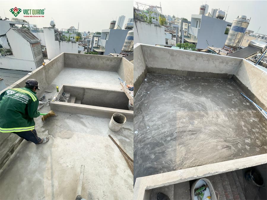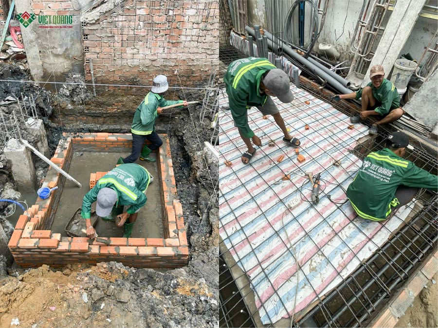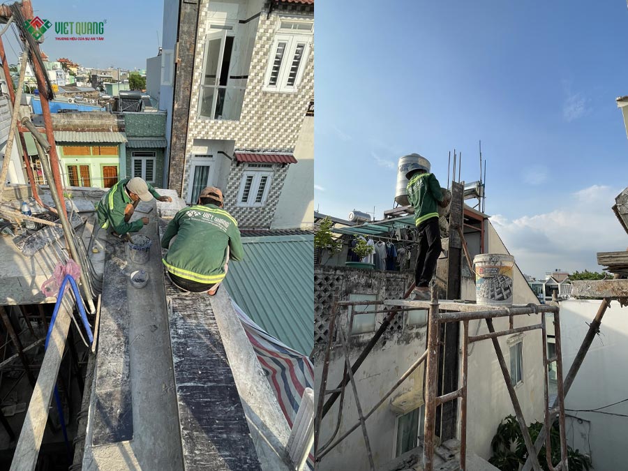 Ở tầng 3 và sàn mái, đội ngũ Việt Quang Group thực hiện đầy đủ dầm – sàn – cột bê tông cốt thép, lưới mắt cáo chống nứt, xây tường bao sân thượng. Song song đó, họp an toàn lao động định kỳ ngày 14 & 28 hàng tháng nhằm đảm bảo an toàn và chất lượng thi công.