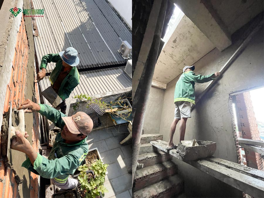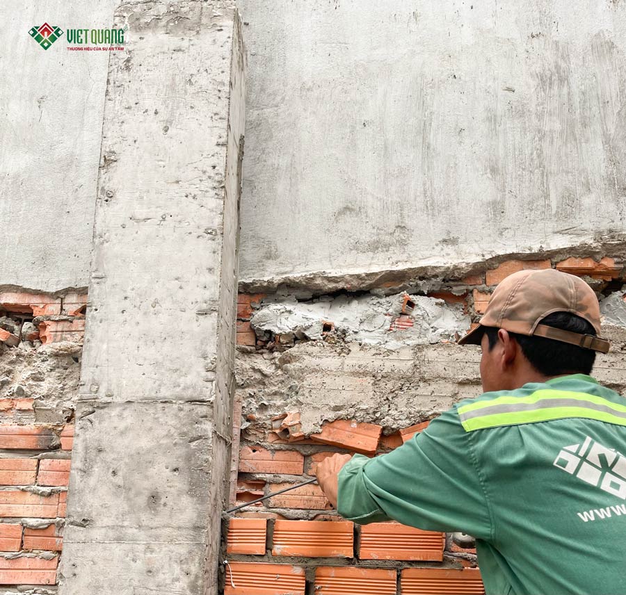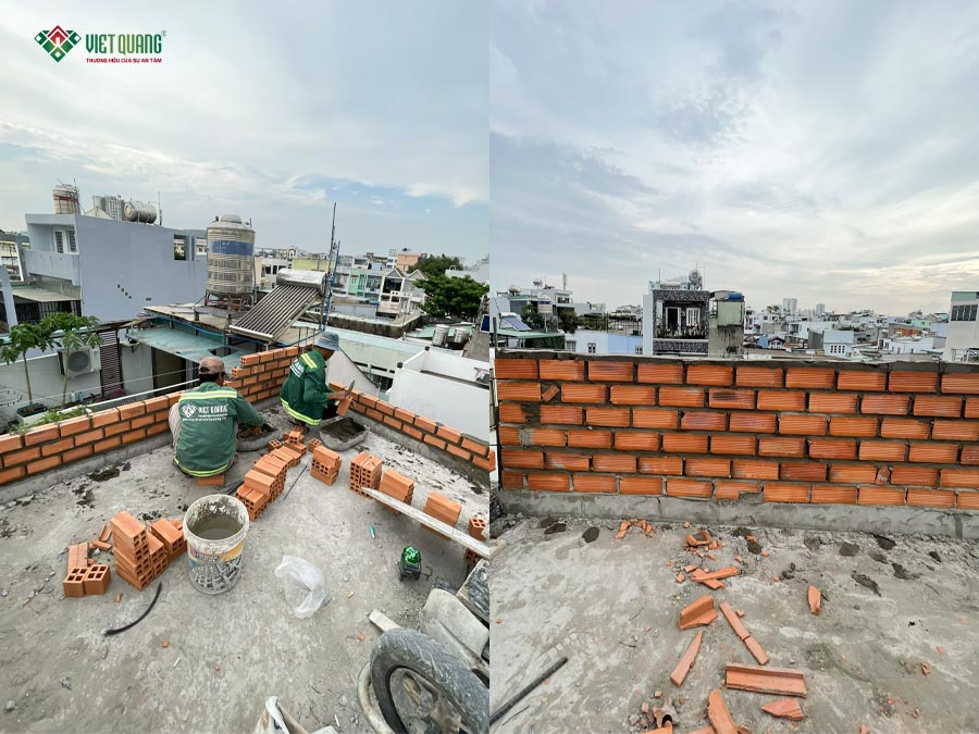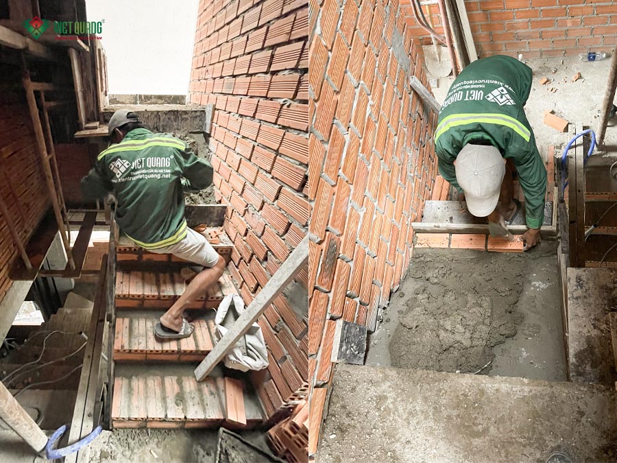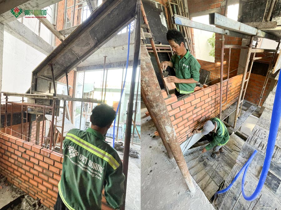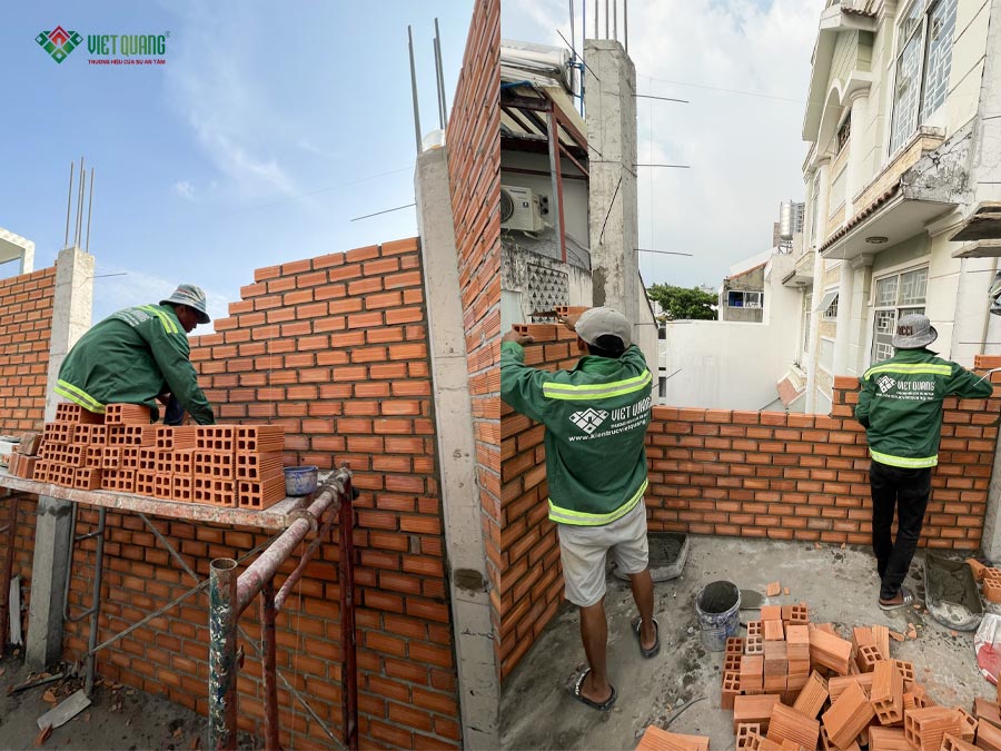 Các công việc xây tường ngăn phòng được thi công sau khi hoàn thành công tác đổ bê tông các sàn. Đảm bảo công trình đẹp, bền vững, đội ngũ Việt Quang Group thường xuyên bảo dưỡng các hạng mục thi công phần thô bao gồm bê tông cốt thép, tường gạch bao quanh ngôi nhà.