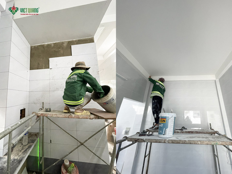 Các hạng mục hoàn thiện được triển khai đồng bộ tô trát trong & ngoài nhà, chống thấm sân thượng, sơn nước, ốp gạch, lắp cửa, thiết bị vệ sinh