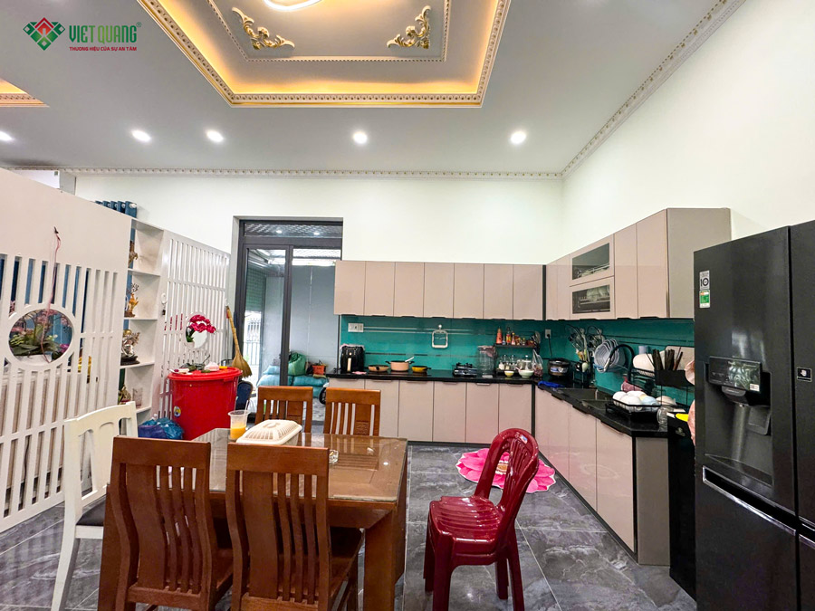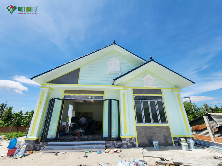 Ban đầu, ngôi nhà được thiết kế với gam màu xám chủ đạo kết hợp điểm nhấn đỏ gạch. Tuy nhiên, trong quá trình thi công, gia đình mong muốn điều chỉnh màu sắc tươi sáng hơn. Kỹ sư phụ trách đã đề xuất phương án sơn mặt tiền màu xanh lá kết hợp viền vàng, tạo nên diện mạo mới mẻ, nổi bật nhưng vẫn hài hòa với tổng thể kiến trúc mái Thái. Công trình được bàn giao đúng tiến độ, hoàn thiện chỉnh chu, sẵn sàng đưa vào sử dụng. Việt Quang Group kính chúc gia đình Chị Lan thật nhiều niềm vui, sức khỏe và hạnh phúc trong tổ ấm mới của mình.