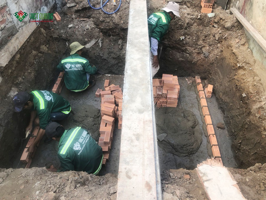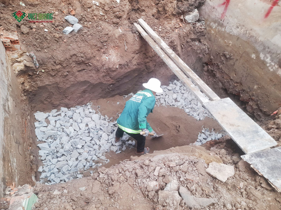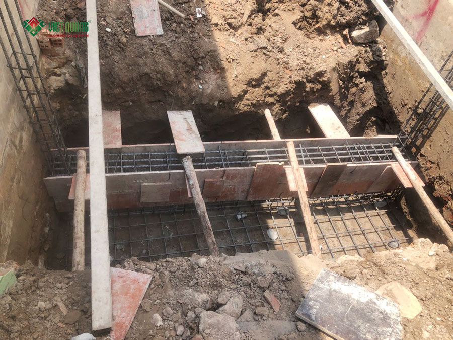 Hạng mục thi công móng bao gồm ép cọc bê tông, đào móng, xây hố ga, bể phân huỷ, thi công dầm móng, lấp đất, làm phẳng nền móng. Toàn bộ quá trình được giám sát chặt chẽ theo bản vẽ kết cấu, đảm bảo độ chính xác và an toàn.