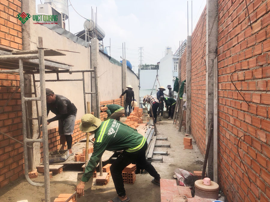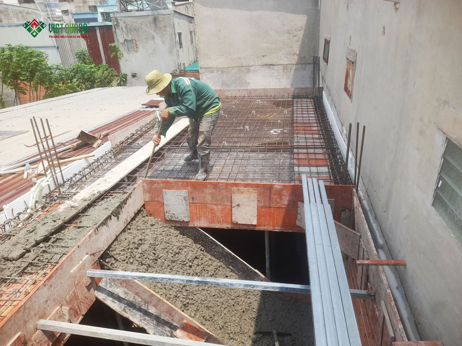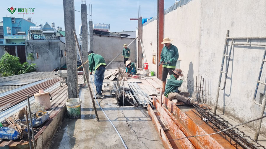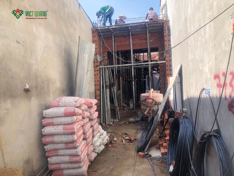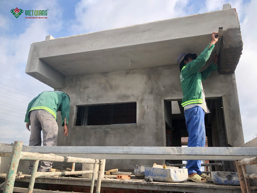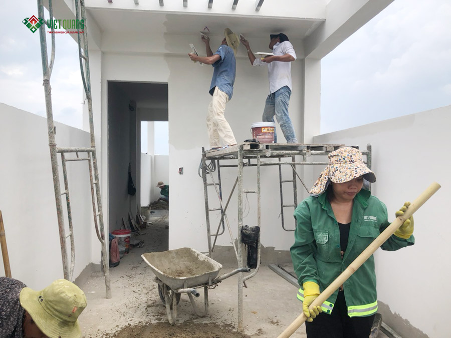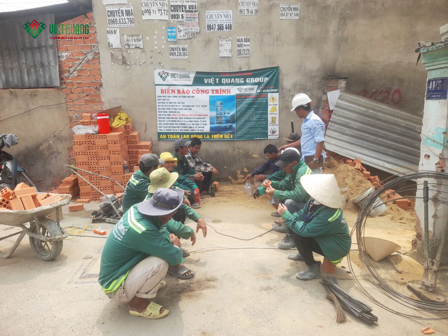 Các hạng mục thi công phần thô như gia công thép sàn, dầm sàn, đổ bê tông sàn các tầng, dựng cột bê tông cốt thép, xây tường ngăn, thi công cầu thang, bảo dưỡng bê tông. Song song đó, đội ngũ Việt Quang Group tổ chức họp an toàn lao động định kỳ, đảm bảo an toàn thi công và tiếp nhận phản hồi từ chủ đầu tư để nâng cao chất lượng công trình.